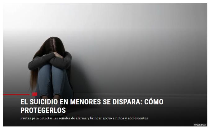 "El suicidio en menores se dispara: cómo protegerlos", de Terry Gragera (Hola.com), es un reportaje que habla sobre el incremento de la tasa de suicidio en jóvenes, que se ha convertido en la primera causa de muerte entre los 15 y los 29 años, para que padres y educadores sepan atender y reconocer las primeras señales de alarma.